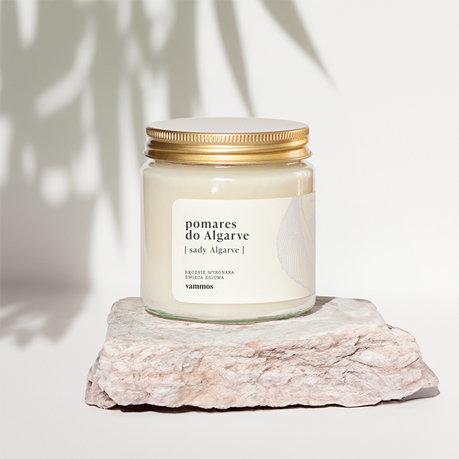 Świeca z naturalnego wosku sojowego, ręcznie zalewana, o słodkim zapachu pomarańczy. Sady Algarve to zapach słodkiej dumy południowej Portugalii, czyli skąpanych w słońcu sadów z najpyszniejszymi pomarańczami.